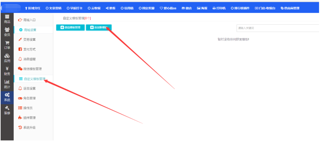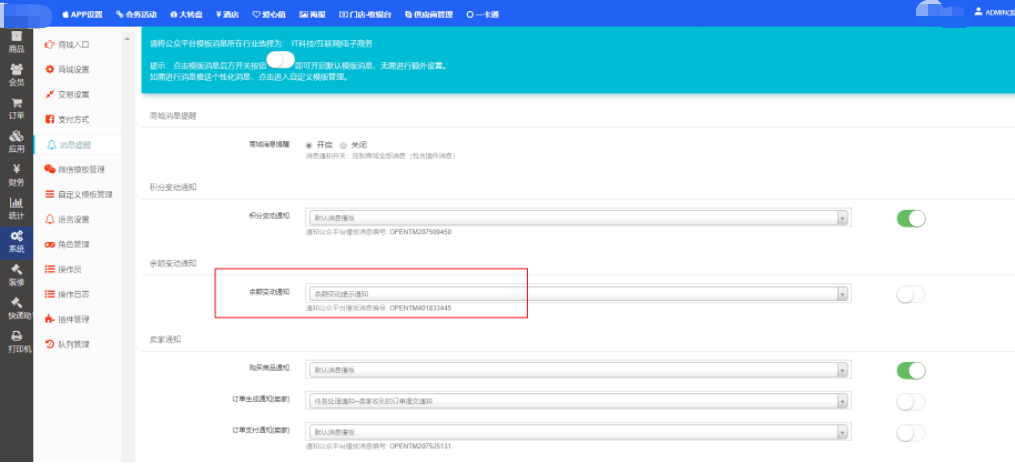 如何使用自定义消息模版?请看以下相关步骤:1,登录公众平台(mp.weixin.qq.com),确认公众号的消息模板已有开通好。【请检查和确保公众平台模板消息所在行业选择为: IT科技/互联网|电子商务】2、接下来开始添加商城自定义消息模板。先进入商城后台,在系统--自定义模板管理--点击添加新模板3、想要添加哪些消息模板,可按下方参考图进行设置。第一点,先选择用到的标题模板。第二点,紧接必须点击‘选择模板’。第三点,点击选择模板后,左侧内容框有变化。(模板名称最好添加标志,方便在余额变动通知那里添加的时候区分)第四点,选择完模板之后再点击选择模板类型【选择模板类型是有搜索功能的,若没出现,多刷新几次】。在右侧模板展示下的勾选框,选择好设置的内容通知,比如您想要添加卖家收到会员付款的通知,此处勾选’卖家通知(会员付款通知)‘。勾选好后,下面同步显示出指定的变量词。 第五点,鼠标点击左侧内容框(显示蓝色边框)后,再点击选择相应的变量词。比如您想要设置带有会员昵称,那么您鼠标点击左侧内容框,再在点击右侧的变量词‘粉丝昵称’,量词便自动显示在内容框中。 注意:①量词和括号为固定,不能私下更改。比如您想将 [粉丝昵称] 改为 [商城会员] ,这是错误的设置,且商城推送的消息通知内容中也不会自动显示会员的昵称,而只是 [商城会员] 这几个大字。②每个模板的变量类型词是对应的、独立的,不能借用其他模板的变量词。4,添加完之后点击保存,然后就可以在自定义模板管理里显示。5,返回消息提醒,去勾选您自定义的消息通知。6、以下是余额变动的自定义模板设置效果。仅供参考。 注意点:1)如果您商城开启默认消息的开关,再选择自定义设置的消息模板,提交保存,那么按照自定义设置的发送,默认消息的开关会自动关闭。2)如果您先选择自定义模板,再开启,点击保存时是无效的,这样还是会选择默认的。