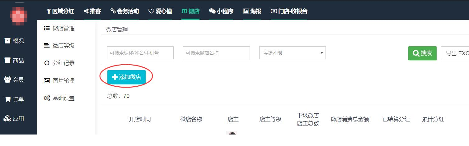 微店插件,通过后台可以直接将指定会员添加为微店店主,如下图: